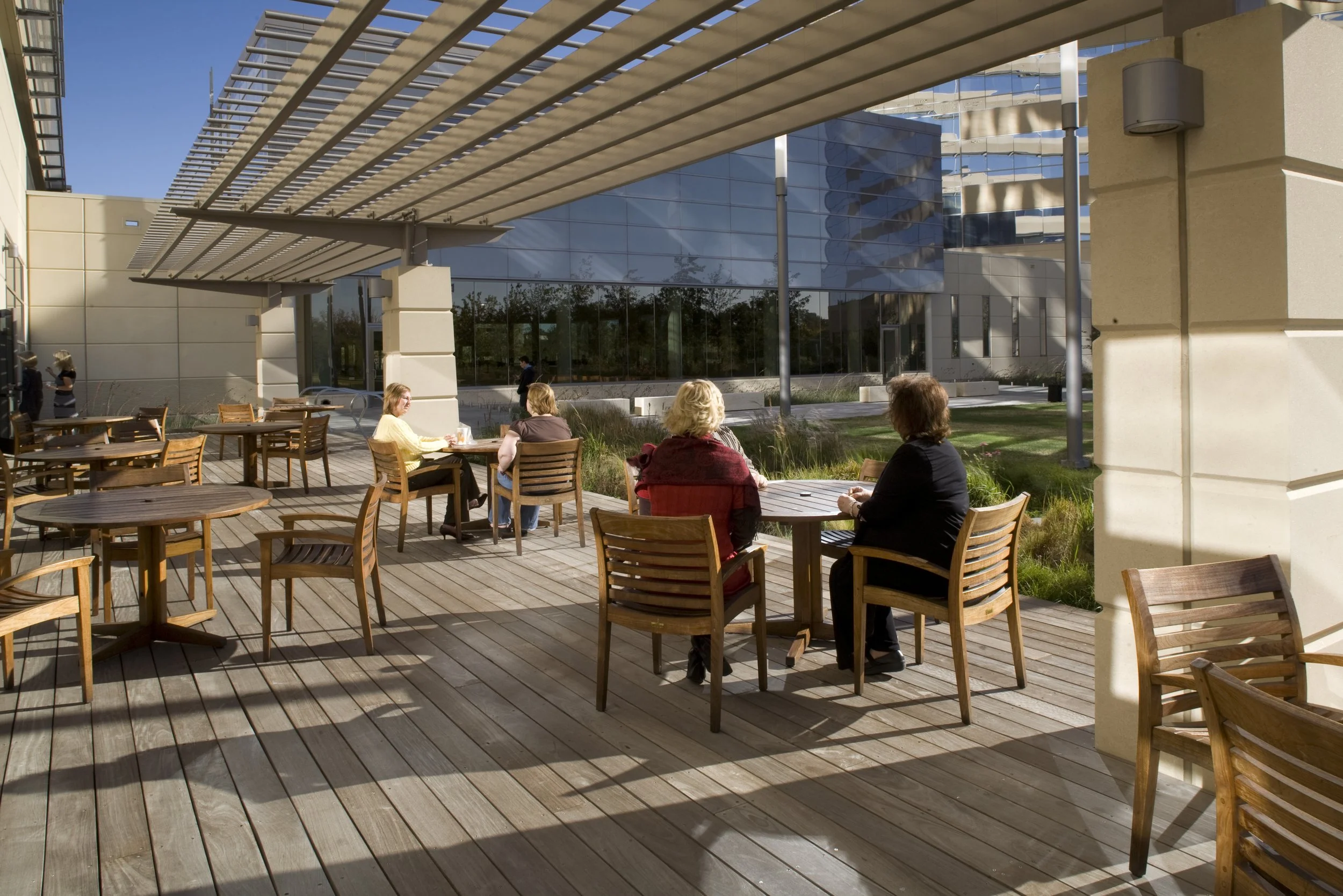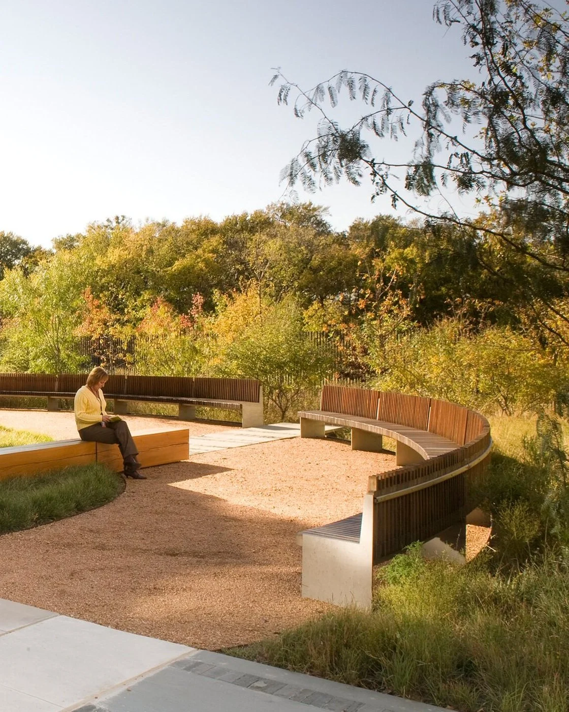 The Blue Cross Blue Shield campus of Richardson, Texas, is located just east of the Galatyn Preserve, an existing creek and greenway that buffers the project site from the nearby highway. This preserve, with its many trees, open walks, seating opportunities, and running water, served as the natural inspiration for the landscape architects to draw upon for concept of this new corporate campus.
