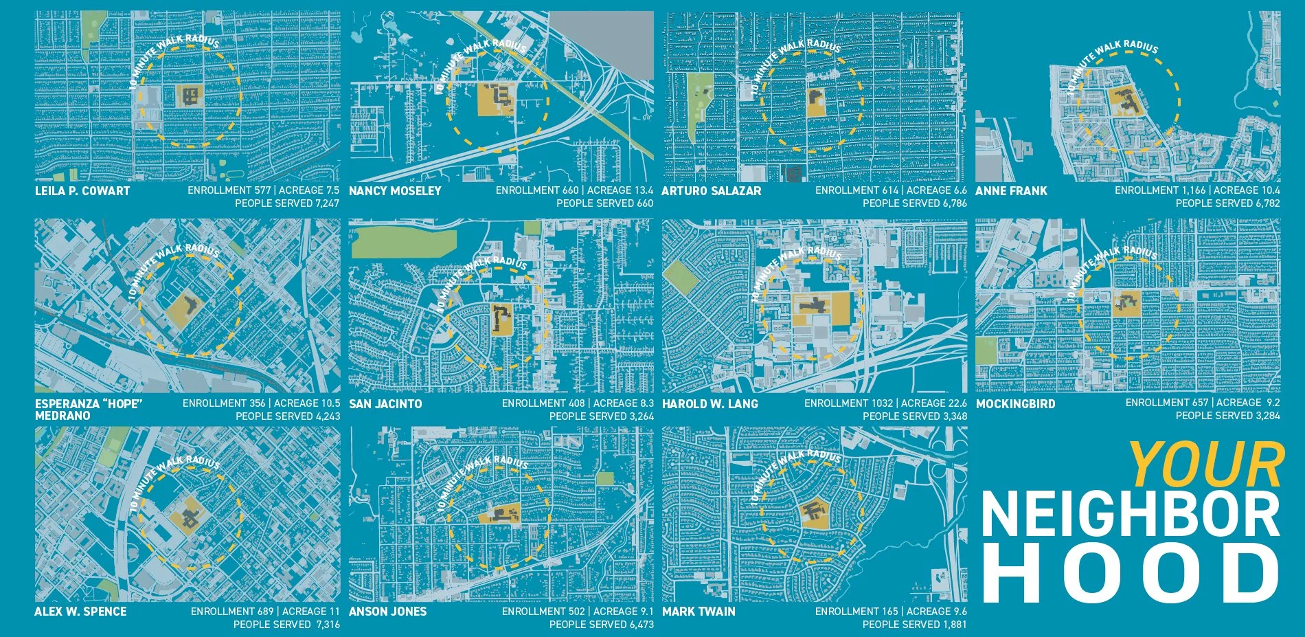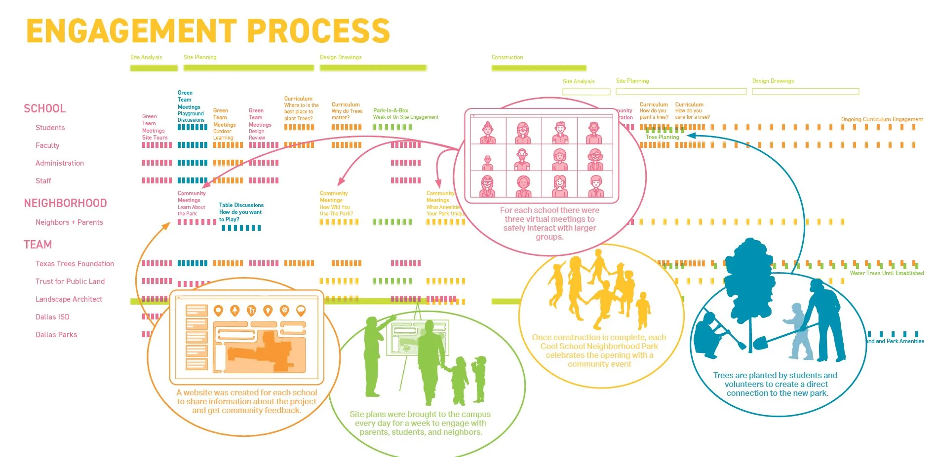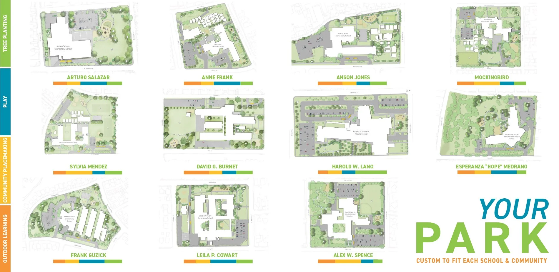 Cool School Neighborhood Parks, a growing branch of the Cool Schools Program, alleviates areas within “park deserts.” Park deserts are areas that do not have a park within a 10-minute walk. Cool School Neighborhood Parks, thanks to a partnership with the Dallas Parks and Recreation Department and the support from generous sponsors, opens the park to the community during after-school hours. Studio Outside has been actively working with Texas Trees to create a successful Cool Schools Neighborhood Park program: from creating initial fundraising collateral to engaging with teachers and students to design site-and-community-specific playgrounds, walking trails, and outdoor classrooms.
