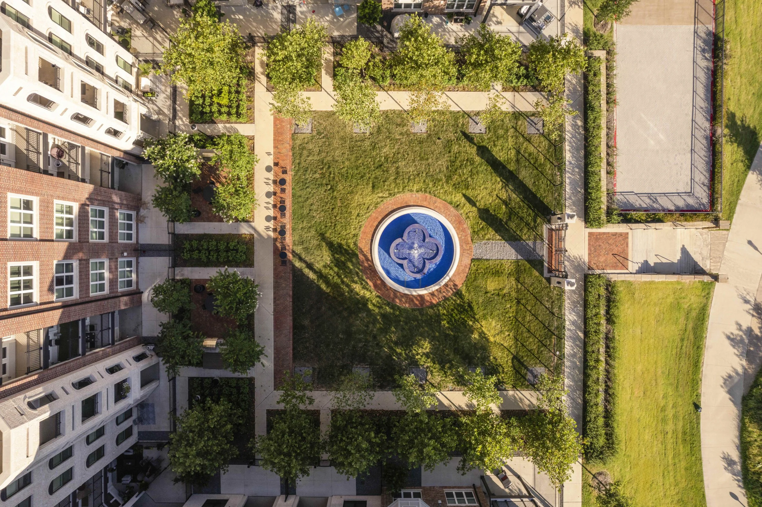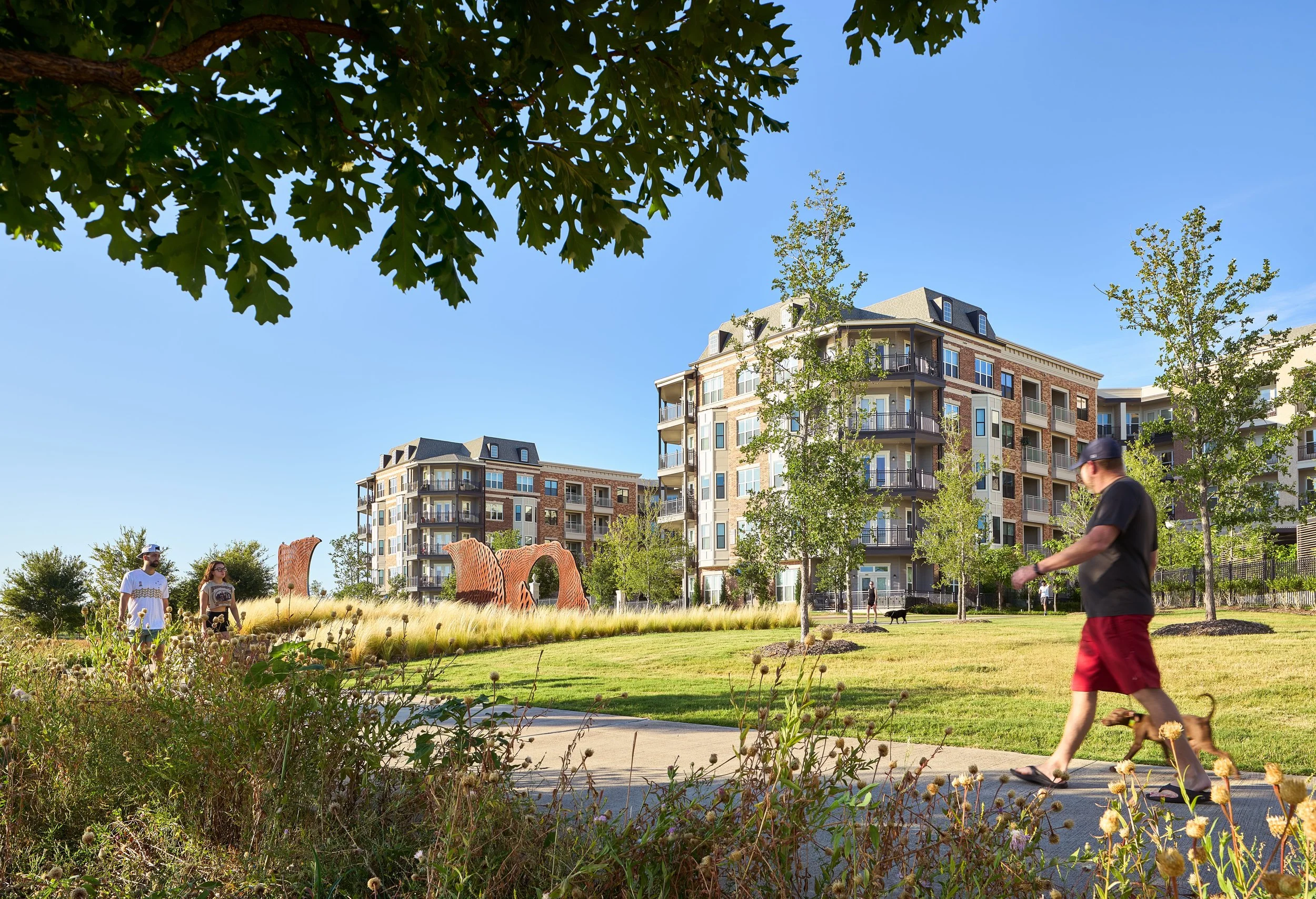 Cypress Waters is a 2,000 acre development surrounding North Lake in Northwest Dallas. This live-work-play community includes several corporate headquarters, office buildings, retail, and several thousand urban living units all connected through an open space and trail network. Public art and a strong streetscape character unify the development while distinguishing sub districts within the whole. While early phases of the project culminate at The Sound lakeside entertainment district, future phases will create a distinct transit-oriented development around an upcoming DART Cottonbelt station on the north side of the lake.