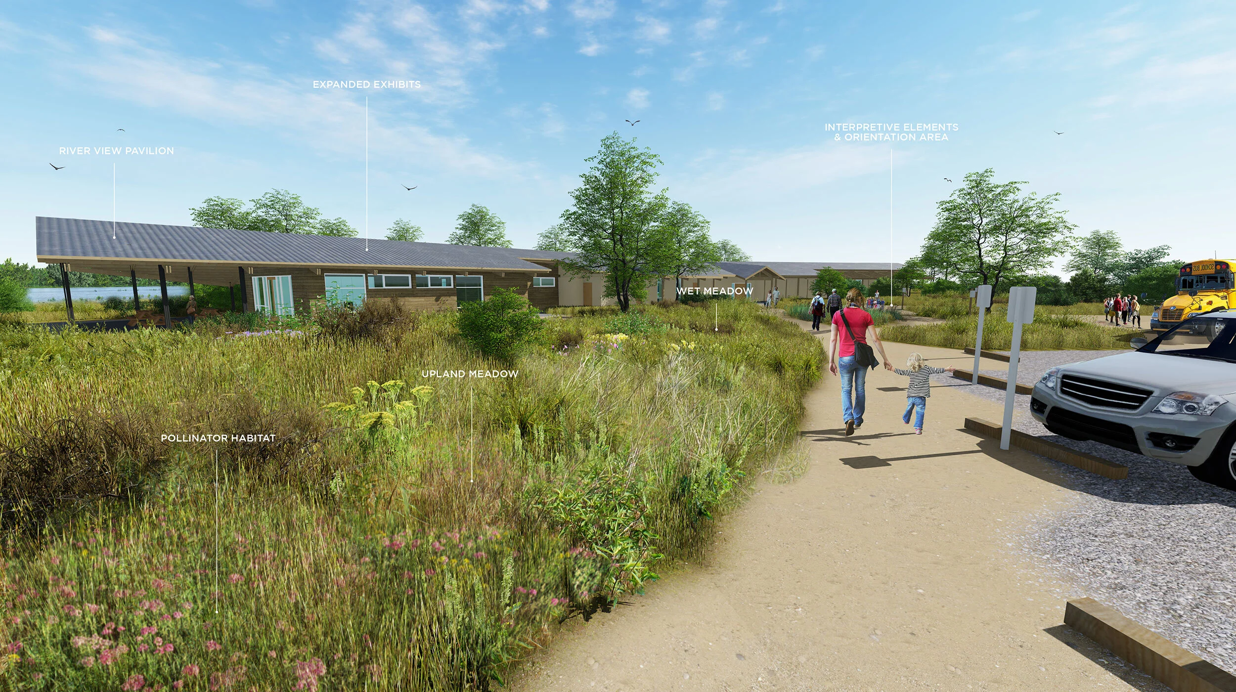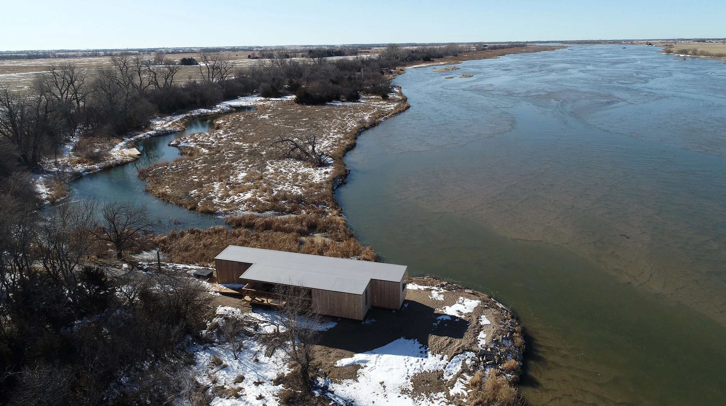 Studio Outside has completed both a master plan and first-phase schematic design for the Iain Nicolson Audubon Center at Rowe Sanctuary expansion in Nebraska. The site claims five miles of frontage on the Platte River, a world-renowned migration stop-over point for Sandhill Cranes headed north each spring. Planning objectives include habitat restoration strategies, new trails and birding blinds, and expansion of programs to encourage year-round visitation. While the discovery center and blinds look to expand program diversity and capacity, the trails seek to engage visitors with the full cross section of the remnant Platte River that was once celebrated as “a mile wide and an inch deep.” The design team—led by Studio Outside and including Lake Flato Architects and Biohabitats—identified the unique opportunity to design for the specific needs and ergonomics of bird watching while improving year-round program opportunities. The new discovery stations engage wet meadows, prairies, and the river to extend the site’s interpretive storylines, while advancing the sanctuary’s status as a premier crane-viewing destination.