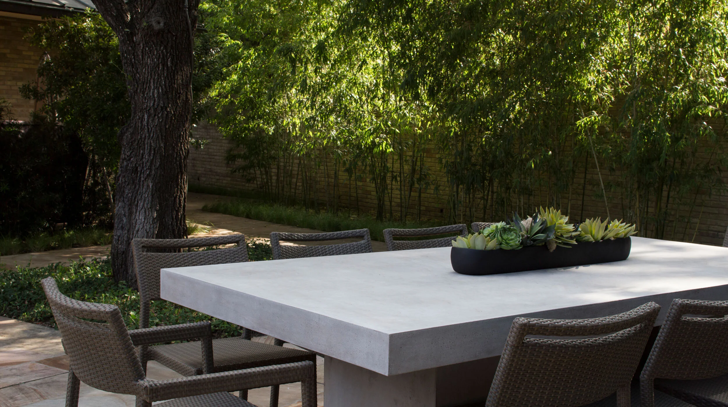 Sited on a sloping site in the heart of Dallas, Texas, Midcentury Creekside exhibits a landscape that combines exquisite detail with the simplicity of form in the architecture of the house. With slightly contemporary tones, but with reverence for the midcentury modern aesthetic of the home, a lower terrace was created to optimize views over the adjacent creek and woods. The upper courtyard and entry into the home seamlessly extend the unique material palette and orthogonal axes of the house into the landscape, creating the feeling that the house and garden