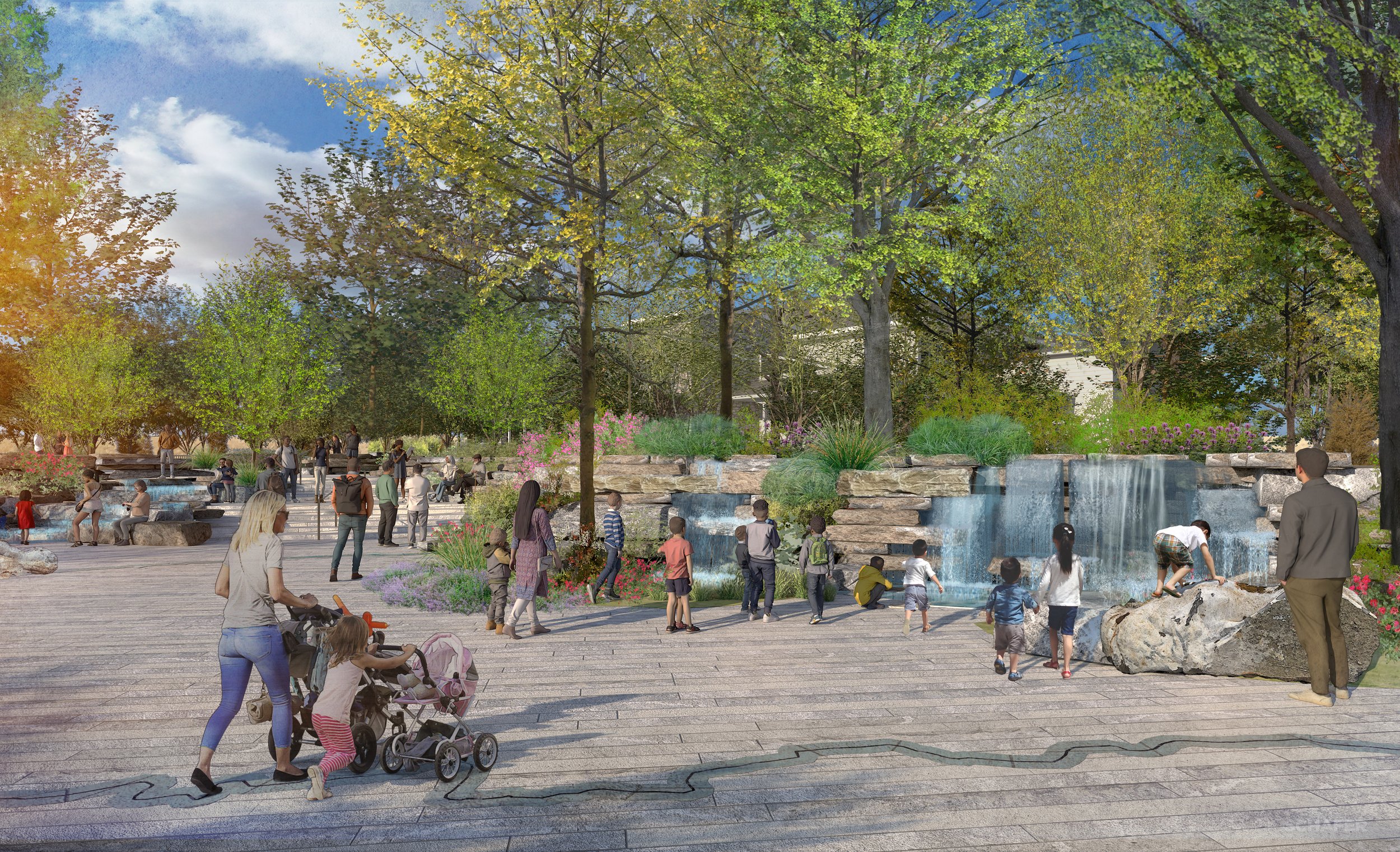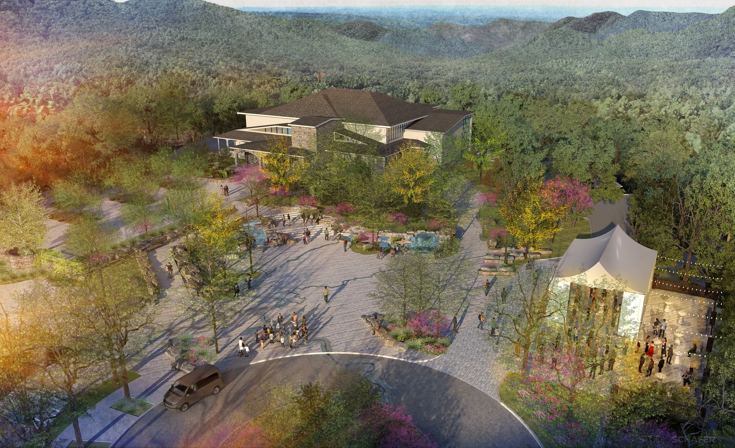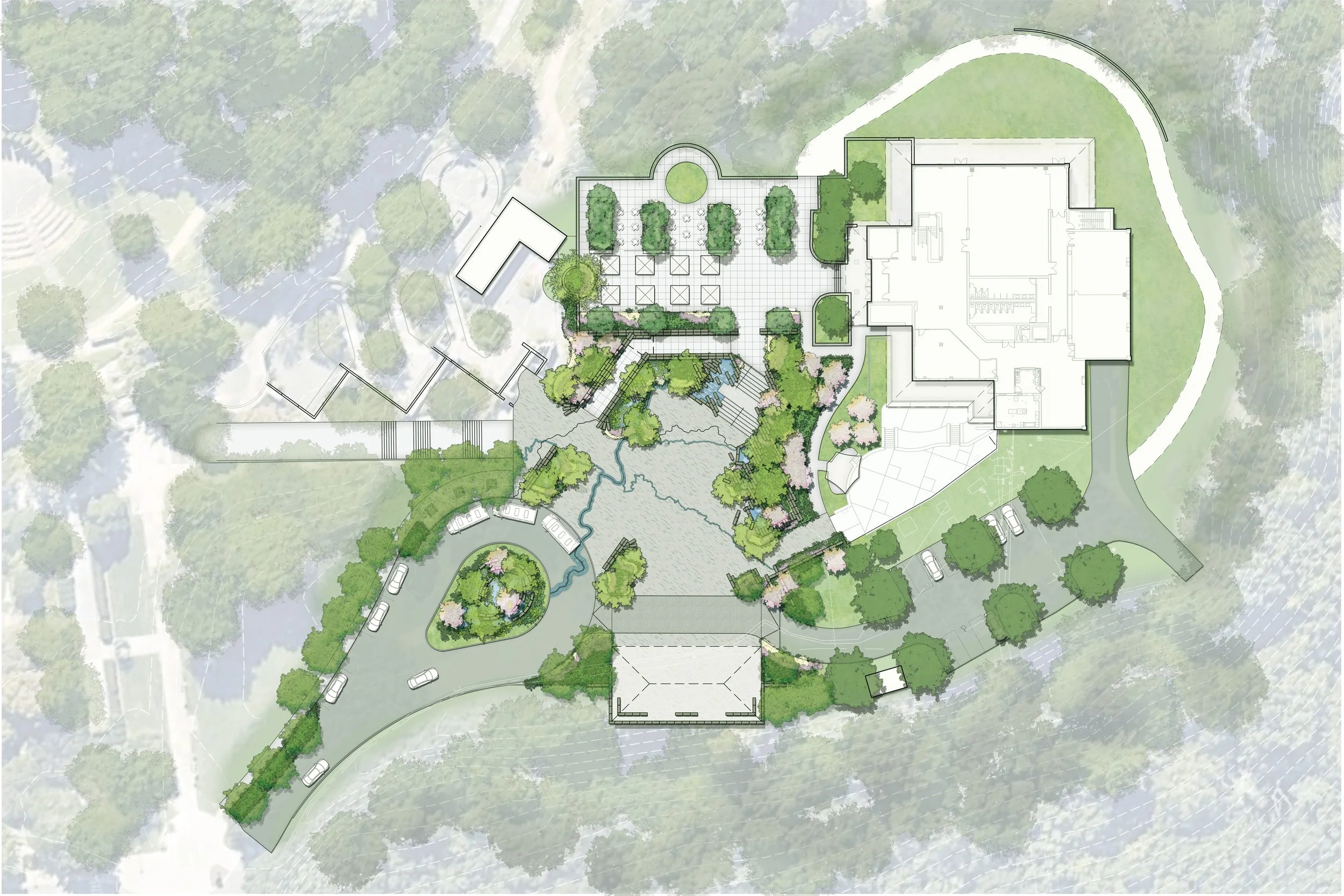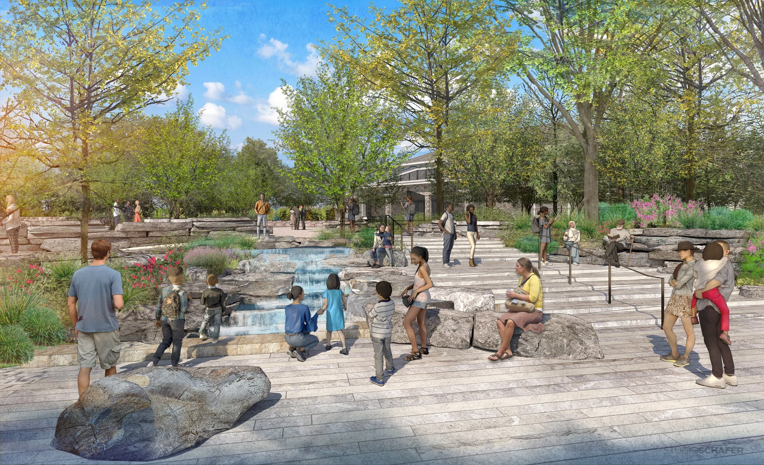 Located in the Appalachian Mountains just south of Asheville, The North Carolina Arboretum offers acres of cultivated gardens along with an integrated trail system connecting the gardens to the forested mountains they sit within. Studio Outside lead the design team in re-imagining a major entry plaza to the arboretum located just adjacent to their community education center. The heart of the plaza is anchored by a water feature inspired by a poetic interpretation of the geology and water systems of the South Appalachian Mountains. The space is designed thoughtfully to perform flexibly for a wide range of uses: a student/children’s camp drop-off and lunch gathering, a teaching space, an event space for a large gala or wedding, or a quiet place to stop and rest. The design uses regional materials and planting to create a genuine and authentic regional experience.