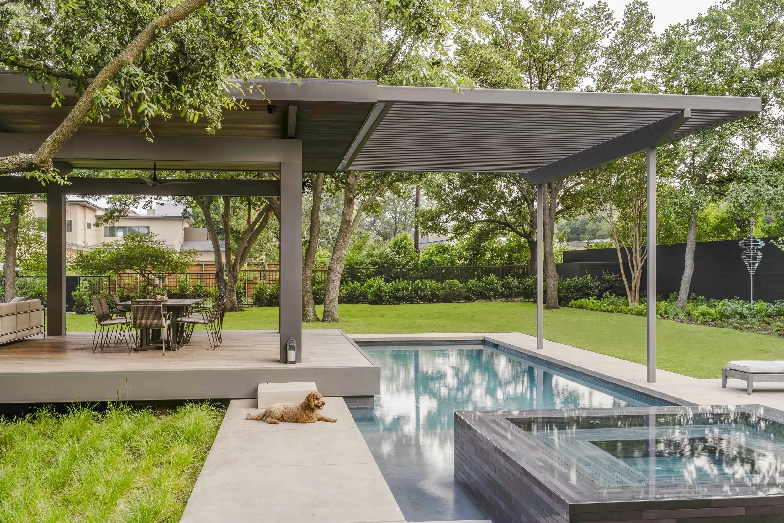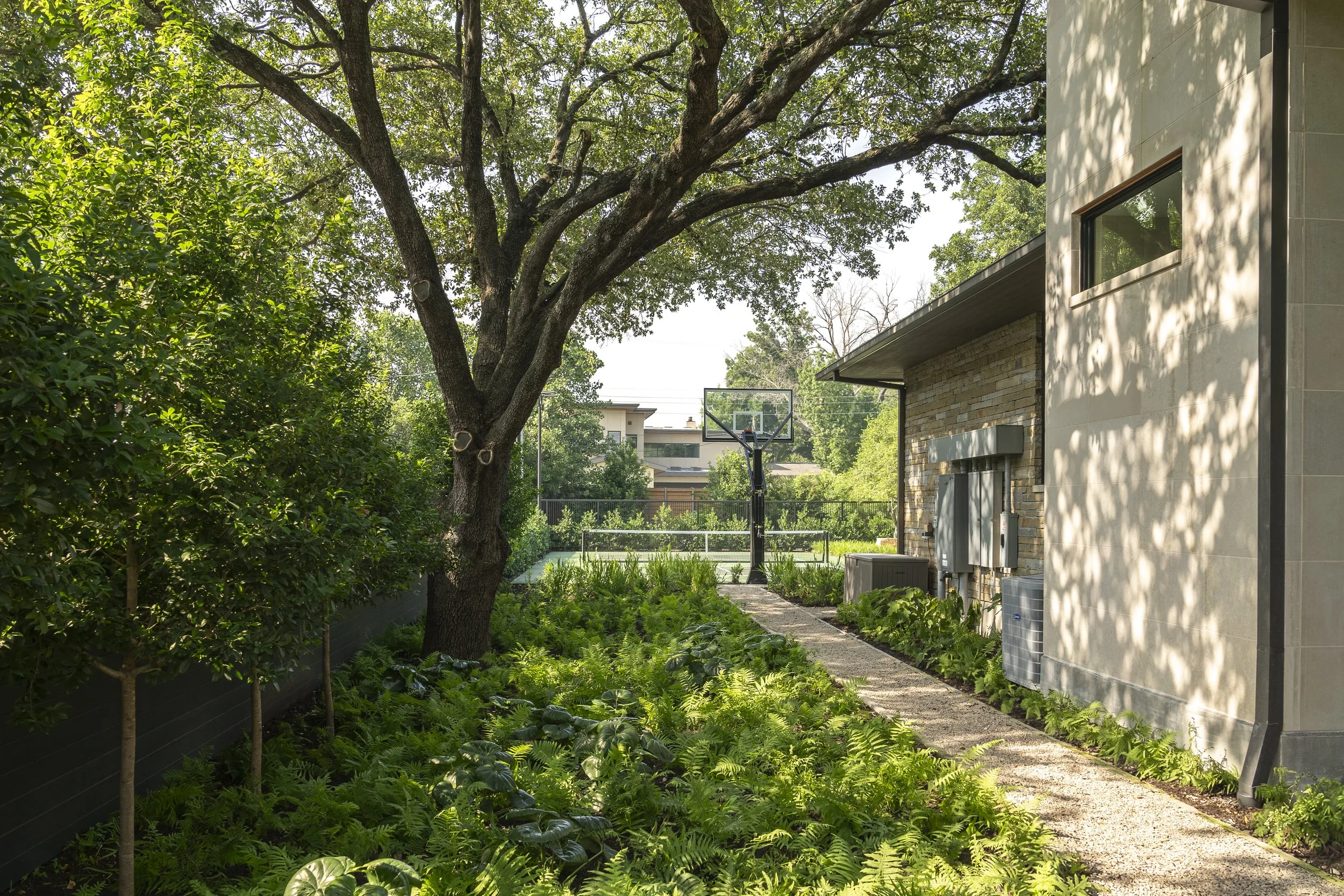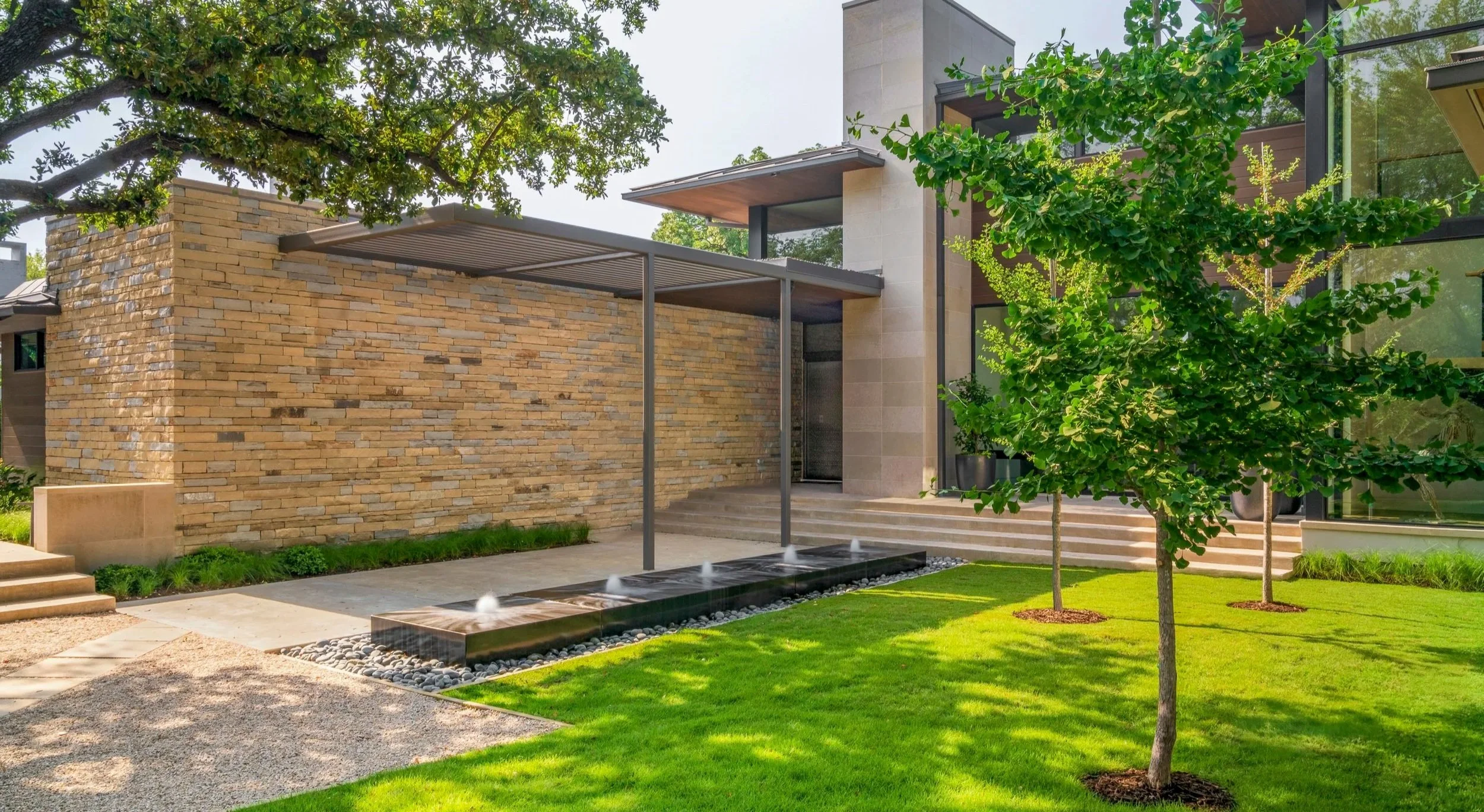 Nestled along a charming street in Preston Hollow, this property’s flat site with mature oak trees inspired a series of outdoor spaces for leisure, recreation, and the client’s sculpture collection. The modern home is thoughtfully positioned away from the street for discreet parking, establishing a sophisticated entry sequence. A low entry wall defines a forecourt with a linear water feature and a striking drift of ginkgo trees guiding visitors to the front door. A centerpiece of the design is the steel-slat pergola suspended above the pool, hovering weightlessly over the landscape. This architectural feature anchors the house, frames views of the backyard, and harmonizes the architecture with the surrounding environment.