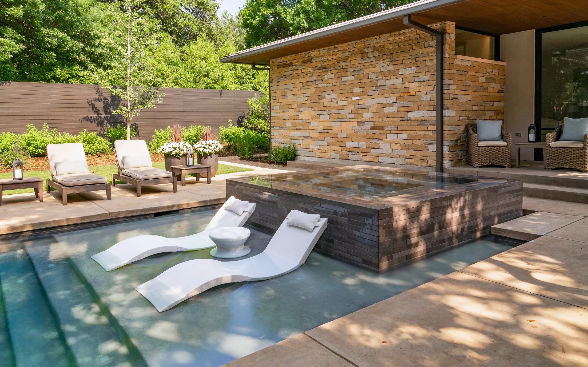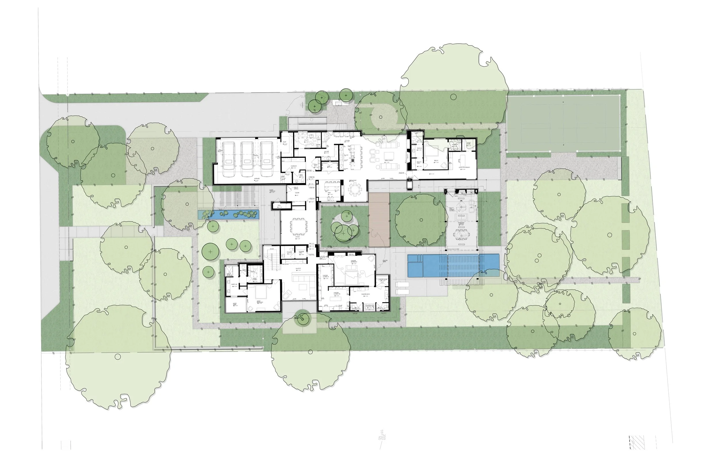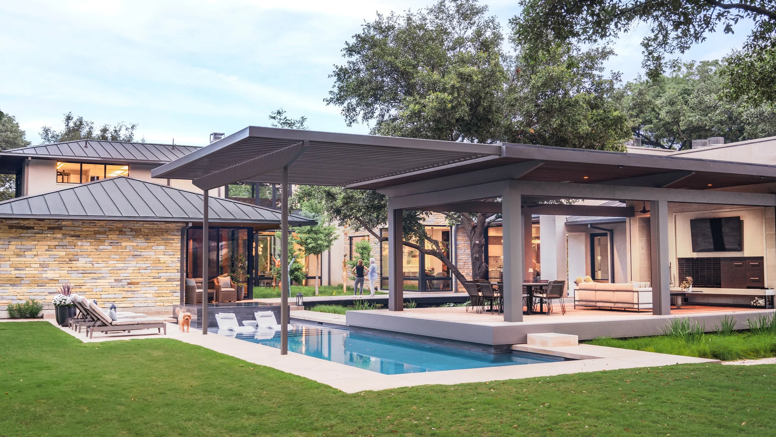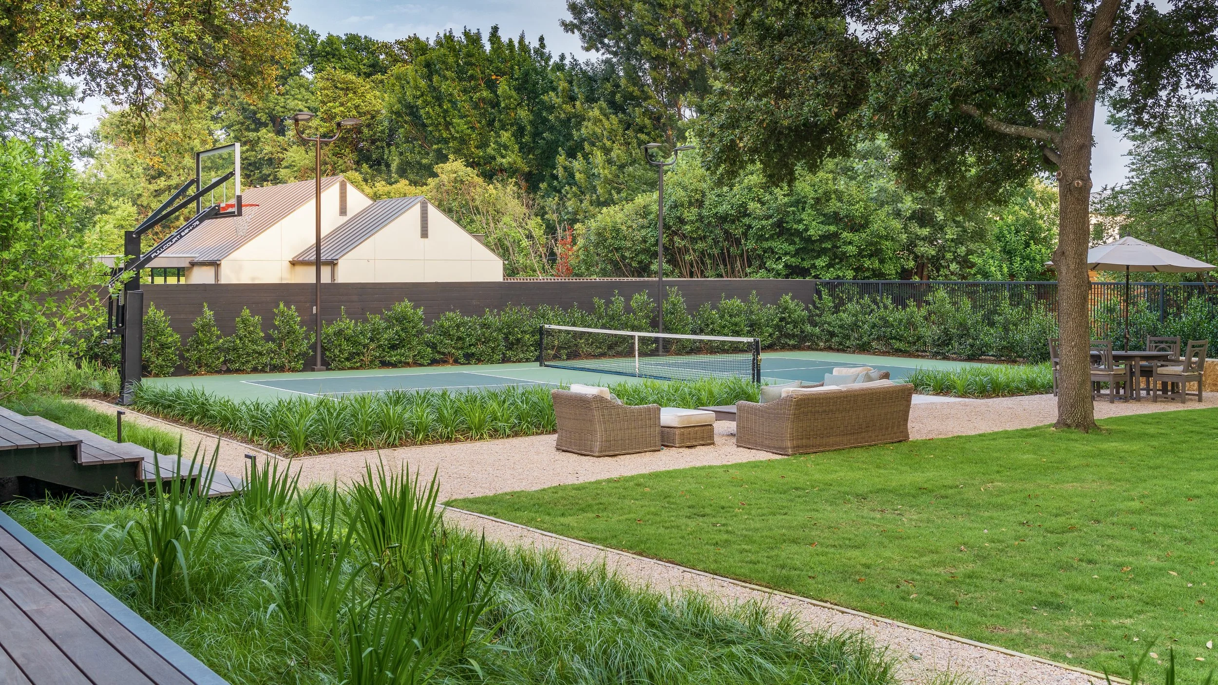 Nestled along a charming street in Preston Hollow, this property’s flat site with mature oak trees inspired a series of outdoor spaces for leisure, recreation, and the client’s sculpture collection. The modern home is thoughtfully positioned away from the street for discreet parking, establishing a sophisticated entry sequence. A low entry wall defines a forecourt with a linear water feature and a striking drift of ginkgo trees guiding visitors to the front door. A centerpiece of the design is the steel-slat pergola suspended above the pool, hovering weightlessly over the landscape. This architectural feature anchors the house, frames views of the backyard, and harmonizes the architecture with the surrounding environment.