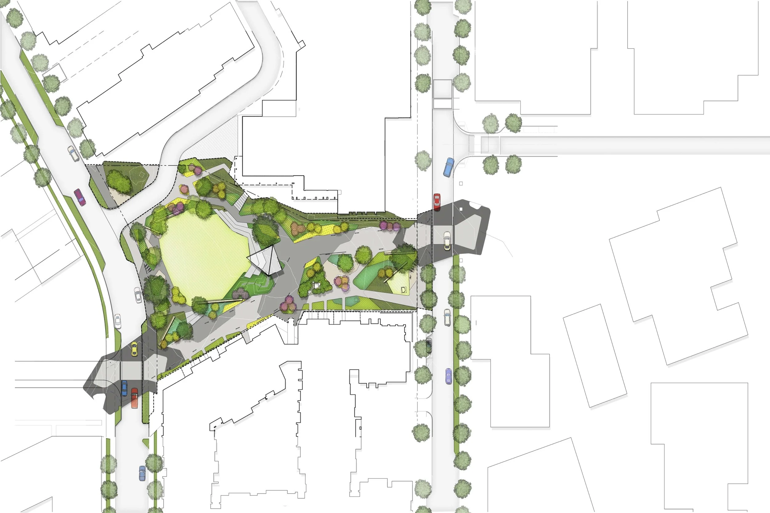 The Bend was the first phase of park development, providing multiple program options to residents and visitors within the development. A central gathering lawn organized the site, offering space for informal gatherings and orchestrated development-wide events. A large pavilion frames the entrance to the lawn, serving as a bandshell, gathering space, and art within the park. Native plantings, trails, and stairs connect the various development patterns to the park in a celebration of community.